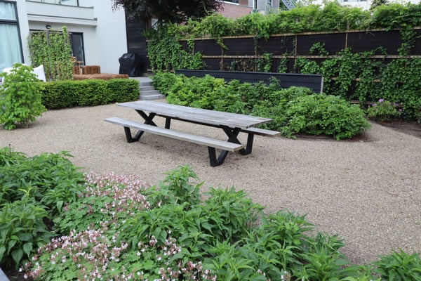 De tuin/terras is betegeld en dus zeer onderhoudsvriendelijk. De afscheiding rondom het terras gebeurt door middel van een raster met hedera en zal alsmede door de hovenier gesnoeid/onderhouden worden. Vanuit hier zijn de grote gezamenlijke binnentuin en de bergingen te bereiken.