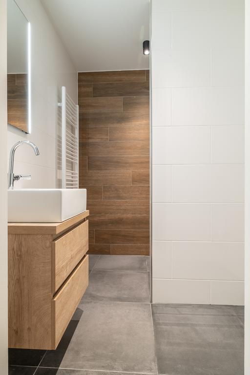 • Volledig betegelde badkamer met een modern wastafelmeubel en een inloopdouche met regen- en handdouche.