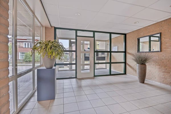Ruime entree met brievenbussen- en video-intercominstallatie, toegang tot de lift en naar buiten.