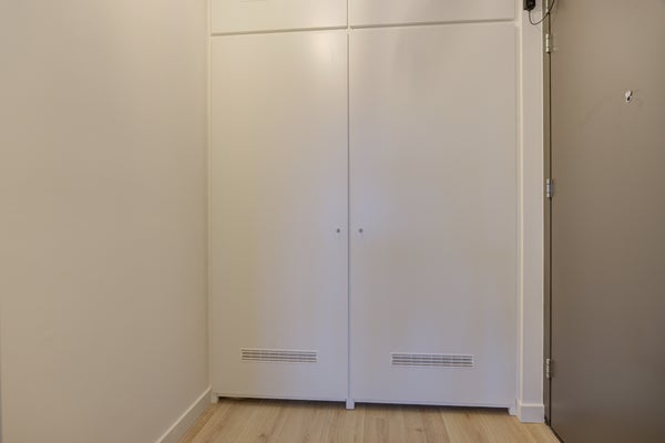 Vanuit de woonkamer is de bergruimte te bereiken. Hier vindt je de opstelplaats van de warmte-terugwin-installatie, de aansluitingen van de wasapparatuur en de verdeler van de vloerverwarming.