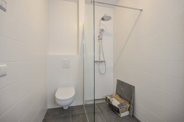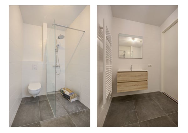 De badkamer is volledig betegeld en beschikt over een inloopdouche (met regen- en handdouche en thermostaatkraan), een wastafel met een meubel, een zwevend toilet en een designradiator.
