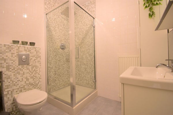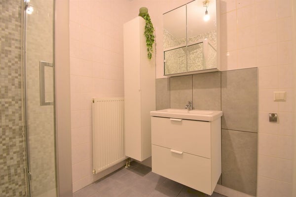 Betegelde badkamer met radiator, zwevend closet, douche, moderne wastafel en ventilatie.