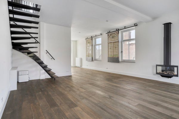 2e verdieping; Hal, toiletruimte met fonteintje, L-vormige living (70m2) met een gesloten gashaard, originele glas in lood schuiframen ter verduistering aan de zijgevel, een luxe open keuken met natuursteen aanrechtblad voorzien van alle apparatuur en openslaande deuren naar een terras van ruim 30m2 op zuid-west.