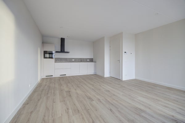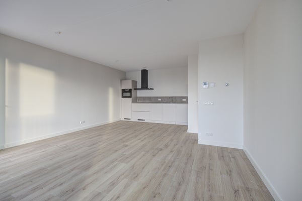 We startten in de woonkamer. Dit is een fijne ruimte door de open verbinding met de keuken. Door de grote raampartijen geniet je hier van veel lichtinval en met een loopdeur stap je gemakkelijk op het balkon.