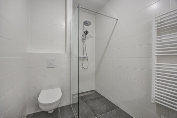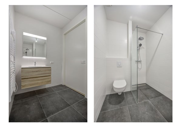 De badkamer is volledig betegeld en beschikt over een inloopdouche (met regen- en handdouche en thermostaatkraan), een wastafel met een meubel, een zwevend toilet en een designradiator.