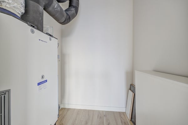 Vanuit de hal is de bergruimte te bereiken. Hier vindt je de opstelplaats van de warmte-terugwin-installatie, de aansluitingen van de wasapparatuur en de verdeler van de vloerverwarming.