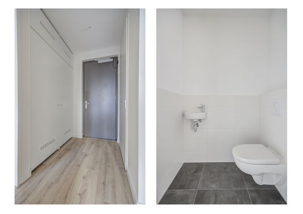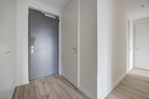 Aangekomen op de 4e verdieping lopen we richting huisnummer 167. We stappen het appartement binnen in de hal. Die geeft toegang tot de meterkast, de deels betegelde toiletruimte (met zwevend toilet en fontein) en tot de overige ruimtes.