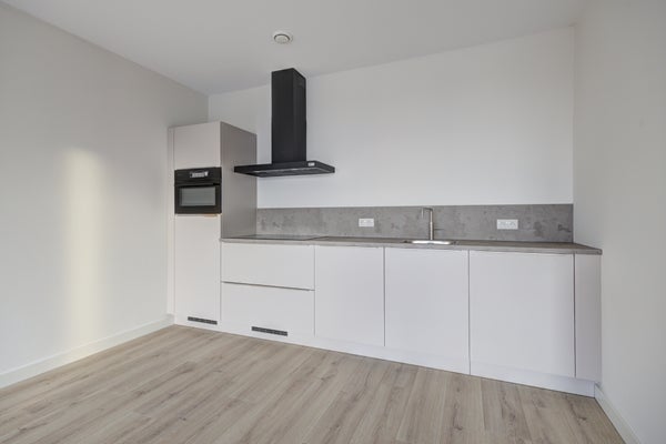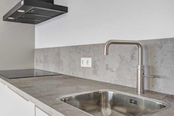 De keuken heeft een rechte opstelling met onderkasten, laden, een 4-pits inductiekookplaat, een afzuigkap en een combi-oven/magnetron (allemaal het merk van AEG). Daarnaast nog een spoelbak met Quooker kraan, een vaatwasser en een kunststof werkblad.