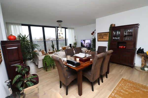 De fantastisch ruime woonkamer beschikt over grote raampartijen en een apart eetgedeelte waar vanuit het riante zonneterras te bereiken is.