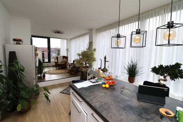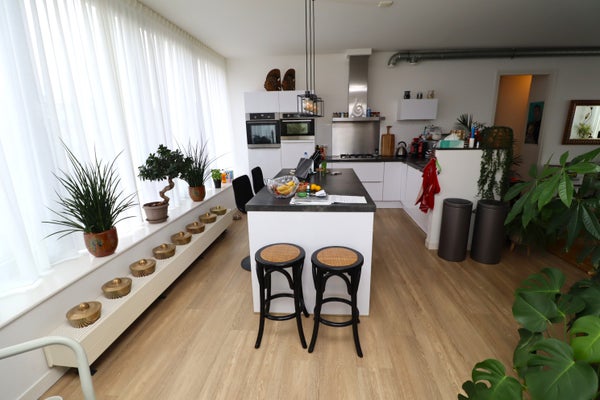 De woonkamer beschikt over een moderne open keuken met spoeleiland welke voorzien is van alle benodigde inbouwapparatuur.