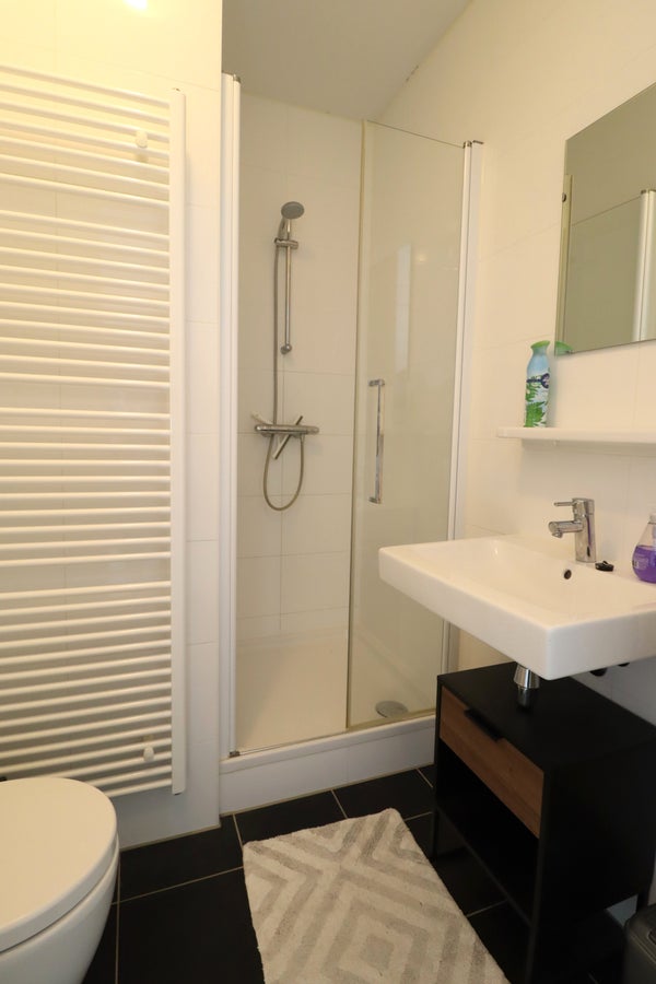 Badkamer II: moderne badkamer met een douche, een wastafel en een toilet.