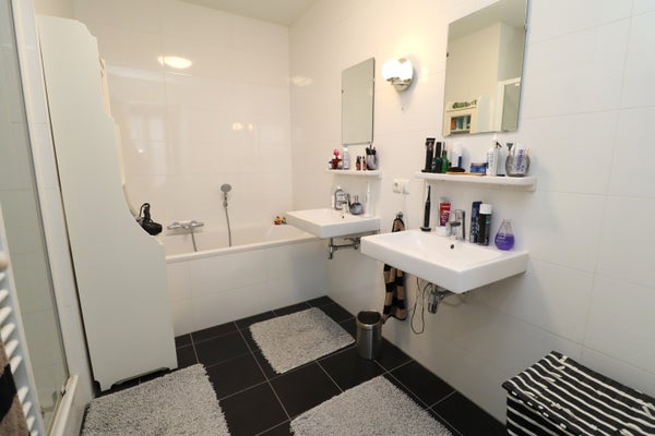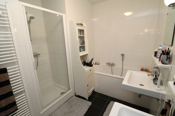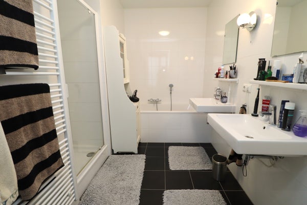 Badkamer I: ruime, moderne badkamer met een douche, een ligbad en twee wastafels.