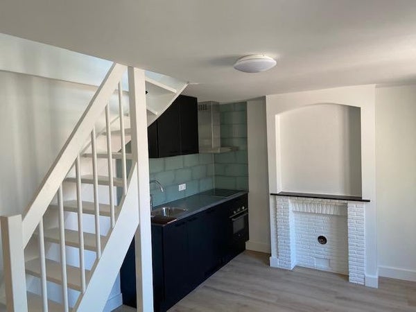 Gelegen op de eerste & tweede verdieping van het achterhuis een maisonnette bestaande uit: entree, toilet en inpandige berging met wasmachine-aansluiting, woon- eetkamer (circa 16 m2) met open keuken. De keuken beschikt over elektrische kookplat, oven, afzuigkap en inbouw koelkast. badkamer met toilet, wastafel en douche. Middels een vaste trap is de tweede verdieping te bereiken met de woon- annex slaapkamer (circa 18 m2) in de kap.