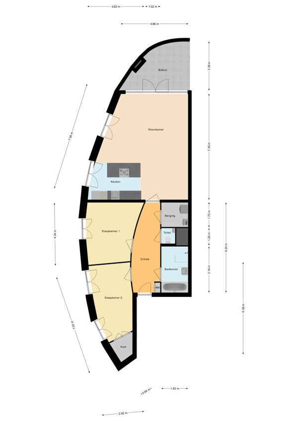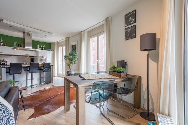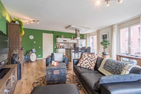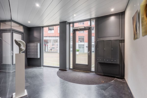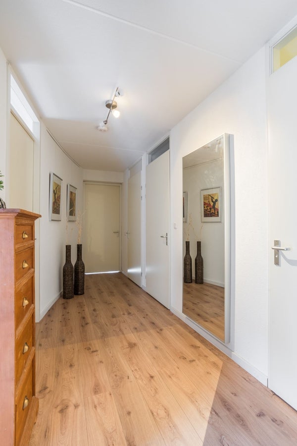 De hal geeft toegang tot de woonkamer, de twee slaapkamers, het toilet, de badkamer, inpandige berging en de meterkast. Vanuit de woonkamer is het ruime en zonnige balkon toegankelijk. Het balkon is gelegen op het zuidoosten met fraai uitzicht. Door de ramen krijgt de woonkamer een fijne lichtinval. De keuken met kookeiland beschikt over diverse apparatuur, zoals een koelkast met vrieslades, vaatwasser, combi-oven, gasfornuis en afzuigkap. Door de breedte van het keukenblad is het mogelijk om hier krukken aan te plaatsen.