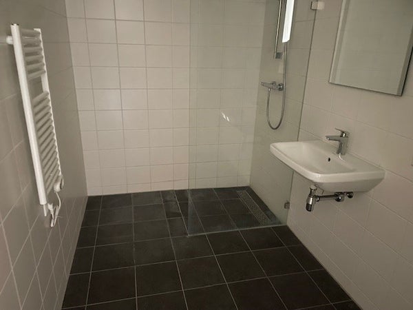 De ruime badkamer beschikt over een inloopdouche en wastafel.