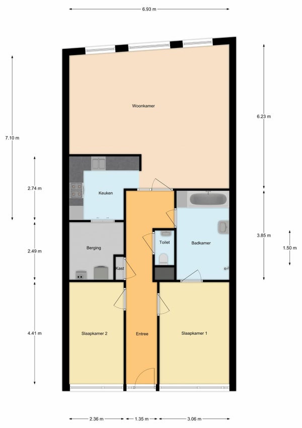 Indeling: entree hal met apart toilet, royale woonkamer ca. 45m2 met open keuken v.v. alle apparatuur en toegang tot een bijkeuken met opstelling cv-ketel en aansluiting wasmachine, twee slaapkamers van ca. 12 en 10m2 en een badkamer met ligbad, inloopdouche en wastafel.