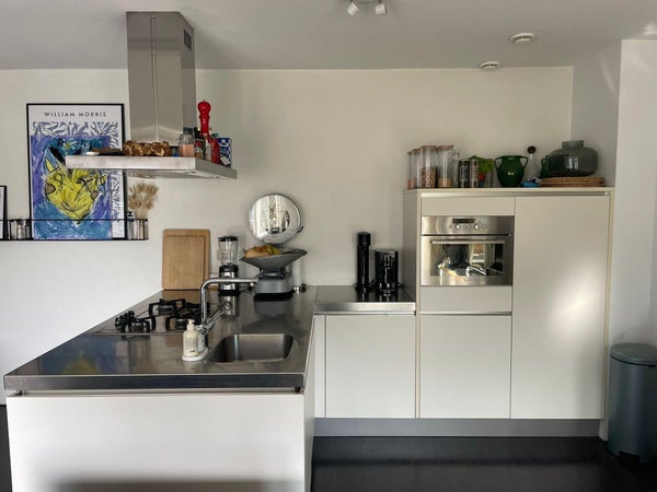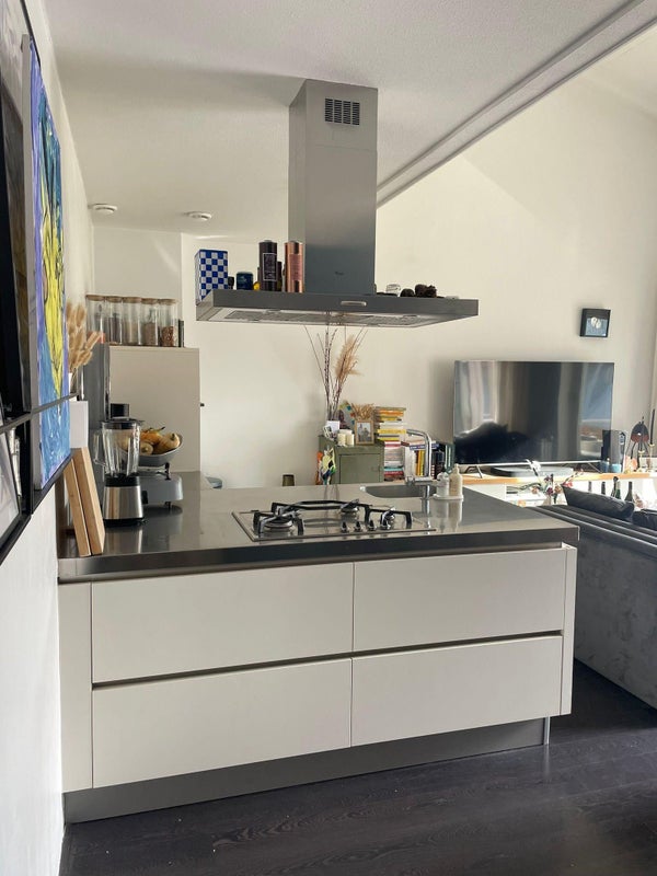 EERSTE VERDIEPING: Sfeervolle woonkamer met fraaie vloer en deur naar het ruime overdekte balkon (9m2). De woonkamer heeft een plafond van 4,5 meter hoog wat een mooi ruimtelijk effect heeft. De moderne keuken scheid zicht van de woonkamer doormiddel van een schiereiland. De keuken is tevens voorzien van een wandopstelling en heeft de volgende apparatuur: 4-pits gaskookplaat, afzuigkap, combi-oven magnetron, koelkast en vaatwasser.