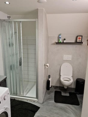 slaapkamer. Badkamer met een toilet, wastafel en een doucheruimte.
