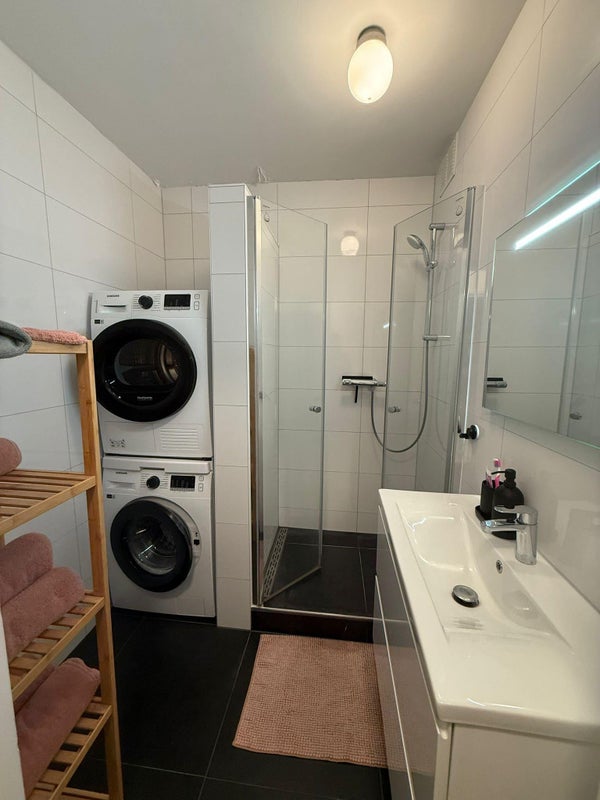 - Badkamer voorzien van douche, wastafelmeubel en wasmachine-aansluiting