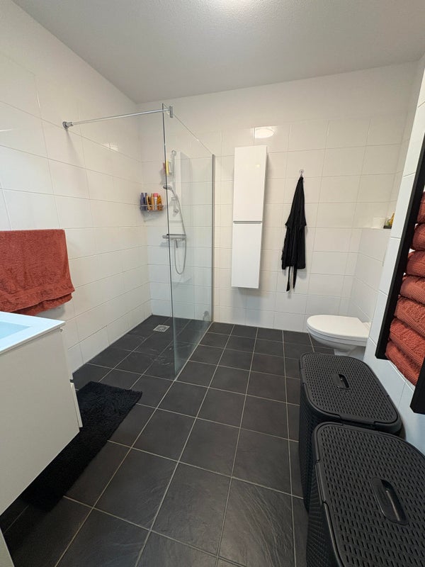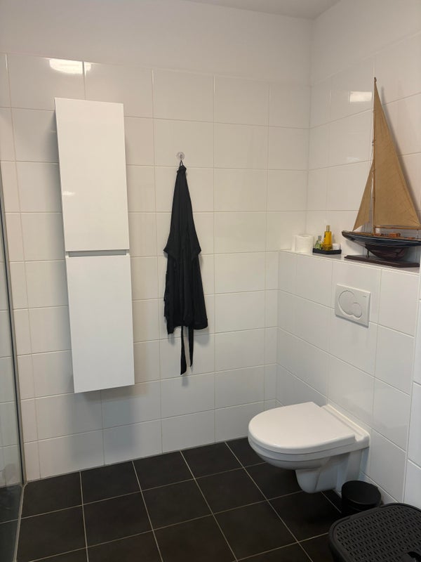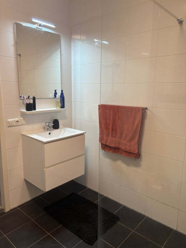 Betegelde badkamer van ca. 6m² met douche, toilet en vaste wastafel.