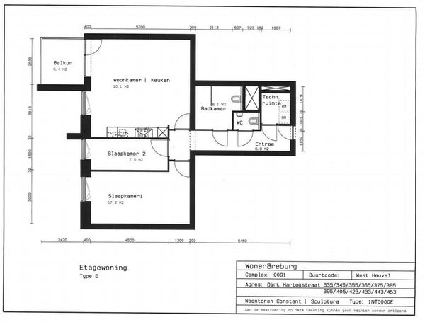 Dit appartement op de 3e verdieping (type E) heeft een totale woonoppervlakte van 77m² met oa. woonkamer/keuken van ca 32m2 en heeft 2 slaapkamers, en aparte toilet, badkamer, een technische ruimte en een balkon op het westen.