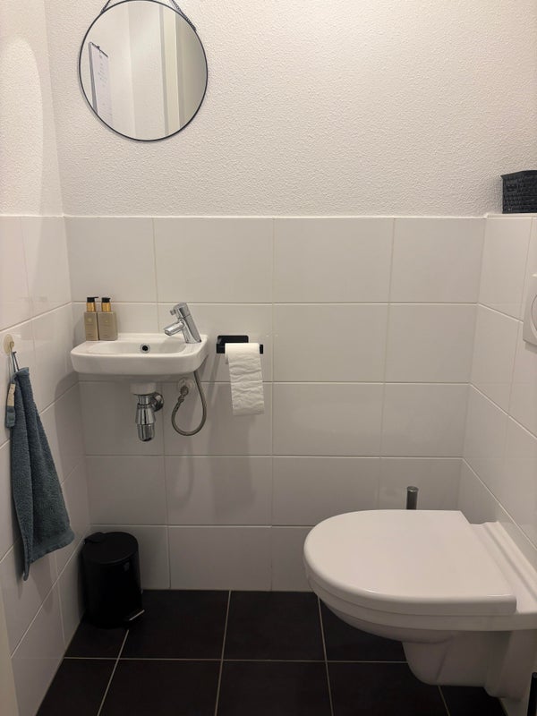 De separate betegelde toiletruimte heeft een wandcloset en fonteintje.