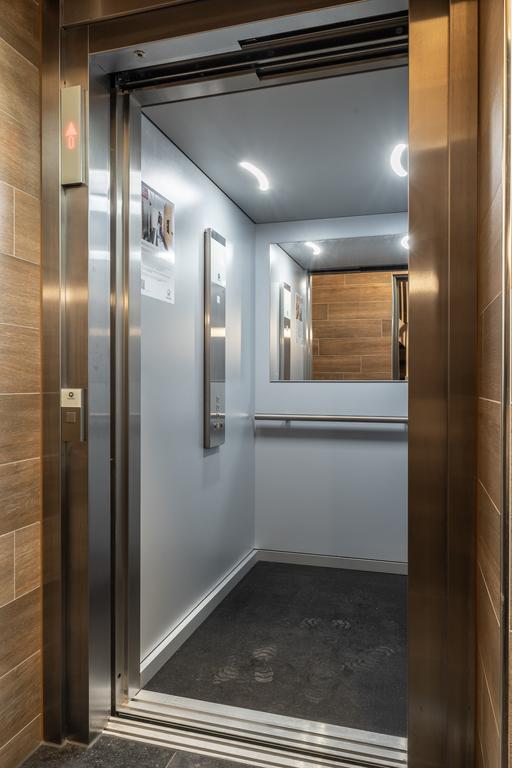 Binnenkomst via de imposante entree van het gebouw met brievenbussen, intercomsysteem en liftinstallatie.