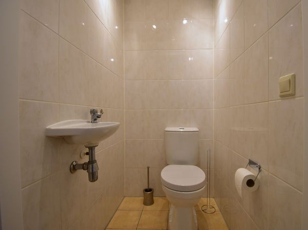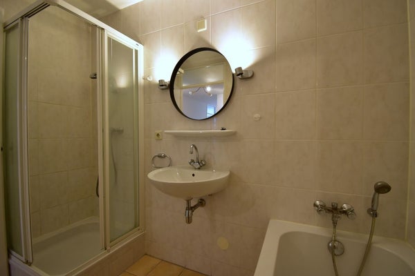 De badkamer is ruim opgezet met een fijn ligbad, separate douche en wastafel. Het separate toilet is voorzien van een fonteintje. Naast het toilet vindt men de technische ruimte met aansluitingen ten behoeve van was apparatuur.