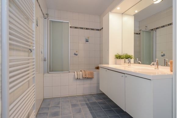 Indeling: entree, hal met apart toilet, living ca. 42m2 met open keuken v.v. alle apparatuur (veel licht inval en harmonicaramen), twee slaapkamers van ca. 10 en 12m2 aan de rustige achterzijde gelegen, een badkamer met ligbad, douche en dubbele wastafel en een inpandige berging.