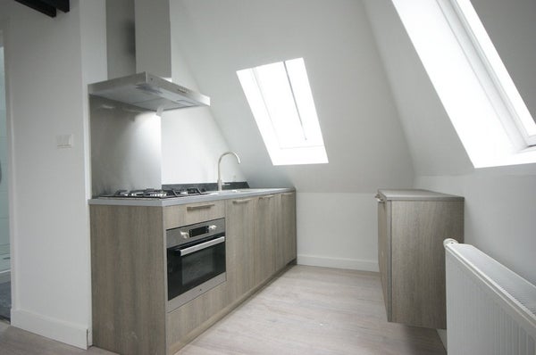 entree naar woonkamer van 25 m2 met dakkapel en open keuken, deze is voorzien van een vaatwasser, oven/magnetron, kookplaat, koelkast en afzuigkap.