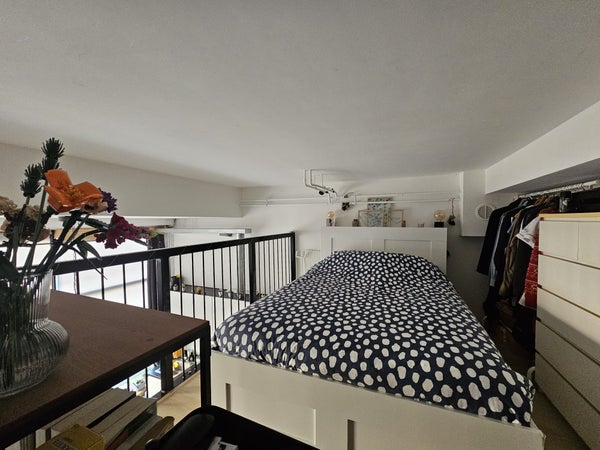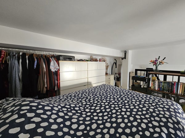 Via een vaste trap kom je bij de entresol (ca. 19m2) met een hoogte van ca. 1.70m. Je hebt hier meer dan voldoende ruimte voor een groot tweepersoonsbed, maar ook lage kasten kun je hier gemakkelijk kwijt.
