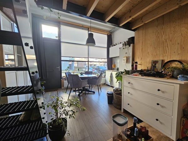 De woning bevindt zich op de begane grond van een grootschalig appartementencomplex en is onlangs compleet getransformeerd naar loftwoning. Bij binnenkomst tref je direct de open keuken die van alle gemakken is voorzien zoals een inductiekookplaat, koel-vriescombi, oven en vaatwasser.