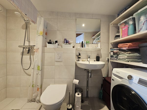 De badkamer bevindt zich naast de keuken op de begane grond en is voorzien van een ruime inloopdouche, toilet en wastafel. Ook de wasmachine-aansluiting bevindt zich hier.