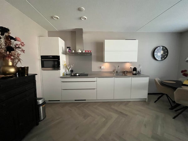 De berging is voorzien van een opstelplaats voor wasmachine, wasdroger, warmte terugwin systeem, warmtepomp en boiler. Bij de woonkamer heeft u toegang tot het balkon. Er is een open keuken in rechte opstelling met een Kwartsiet werkblad met veegrand en inbouwapparatuur: inductiekookplaat, combimagnetron, koelvriescombinatie, wandschouwkap en vaatwasser. De badkamer is voorzien van bad, douche met glazen douchedeur, toilet en dubbele wastafel. Ook zijn er 2 slaapkamers.