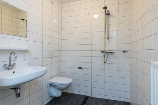 Betegelde badkamer voorzien van douche, toilet en wastafel