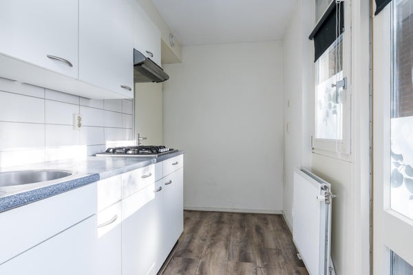 Woonkamer voorzien van zonwering en met toegang tot balkon Keuken voorzien van gaskookplaat en afzuigkap en toegang tot cv- / wasruimte met aansluiting wasapparatuur