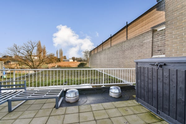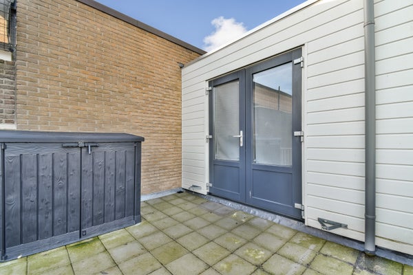 De woonkamer is voorzien van een open keuken en geniet van veel natuurlijk licht dankzij de openslaande deuren aan de achterzijde. Vanuit de woonkamer heeft u direct toegang tot het zonnige dakterras, gelegen op het zuidoosten. Een heerlijke plek om te ontspannen en te genieten van de ochtend- en middagzon.