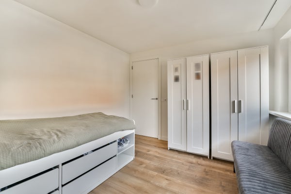 Op de eerste verdieping bevinden zich twee slaapkamers, voorzien van strak stucwerk en een nette vloerafwerking. De kamers zijn licht, ruim en flexibel in te delen als slaap-, werk- of logeerkamer. De slaapkamer aan de achterzijde heeft middels het balkon toegang tot het dakterras.