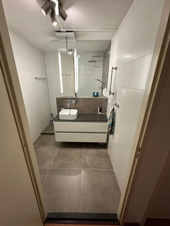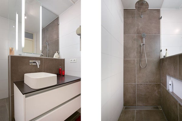 De design badkamer (2018) is hoogwaardig afgewerkt en voorzien van een inloopdouche met stortdouche, handdouche, inbouw thermostaatkranen, glazen douchewand, design radiator, handdoekenrek en een badkamermeubel met spiegel en verlichting.