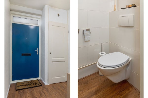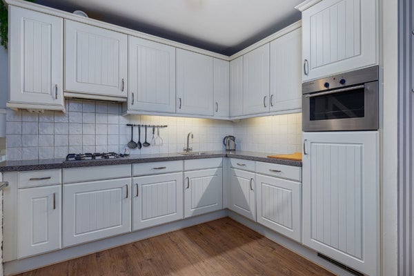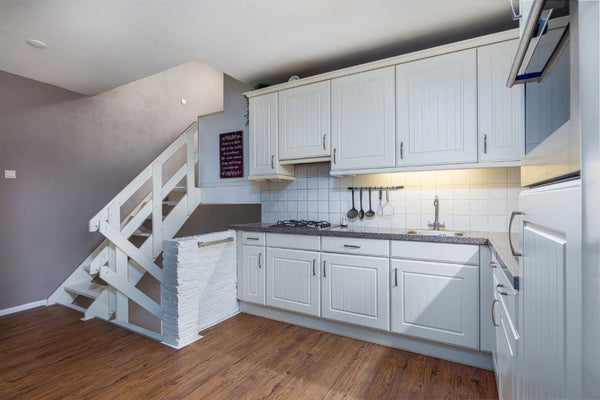Entree via de hal met toegang tot het separate toilet en de keuken. De keuken is volledig uitgerust en uitgevoerd met witte keukenkastjes en voorzien van een gaskookplaat, afzuigkap, vaatwasser, magnetronoven, koelkast, vriezer en veel opbergruimte. Vanuit de keuken is er toegang tot slaapkamer 1 aan de voorzijde van de woning, de trap naar boven en de trap naar de woonkamer.