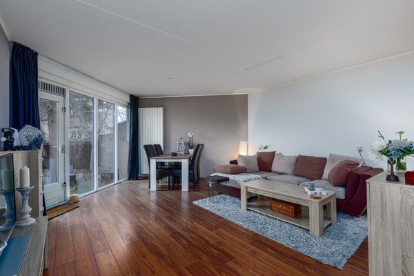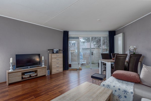 De woonkamer is ruim opgezet en bevindt zich op de lager gelegen verdieping. Vanuit de woonkamer is er directe toegang tot de royale achtertuin. De tuin is netjes aangelegd en beschikt over een schuur, ideaal voor extra opslag.