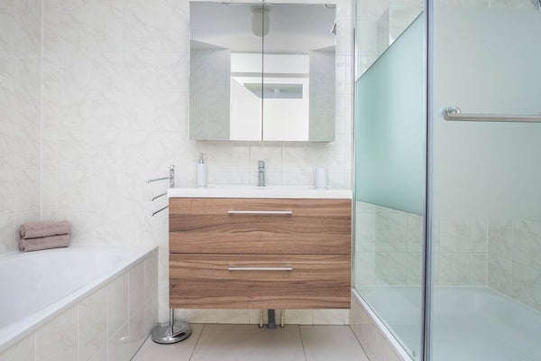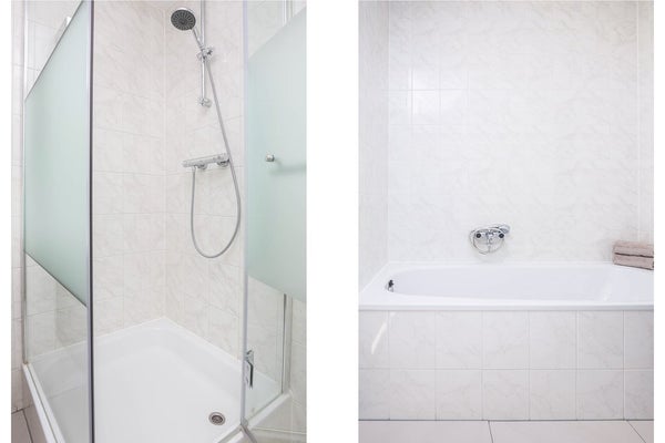 De ruime badkamer is voorzien van een ligbad, douchecabine met thermostaatkraan en een wastafel met meubel. Het appartement is voorzien van twee slaapkamers.