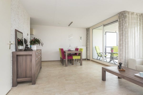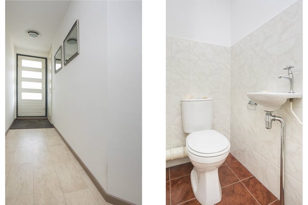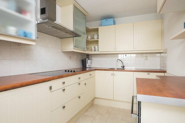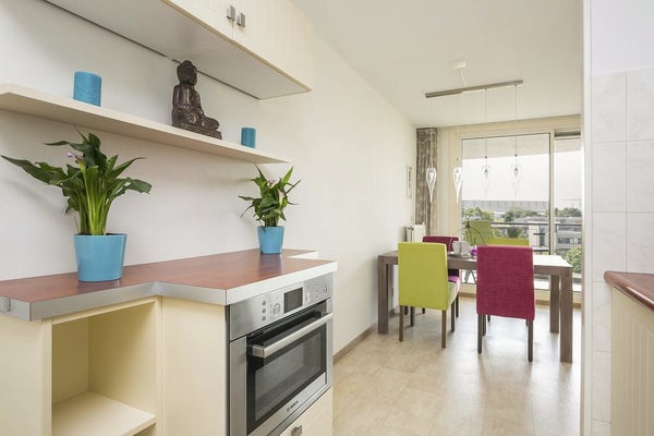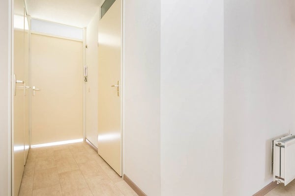 Entree met hal en ruime gang. Hier bevindt zich de meterkast met aardlekschakelaar en 6 groepen. Ook vindt u hier het toilet met fonteintje en een ruime bergkast waar de cv-ketel opgesteld staat en waar u aansluitingen voor wasmachine en droger vindt. Verder biedt de gang toegang tot de woonkamer, badkamer en de twee slaapkamers. De lichte woonkamer beschikt over een aluminium schuifpui, welke toegang biedt tot het zonnige balkon met vrij uitzicht. De nette keuken in L-opstelling beschikt, naast veel bergruimte, over de volgende inbouwapparatuur; keramische kookplaat, rvs-afzuigkap, vaatwasser, koelkast en combimagnetron.