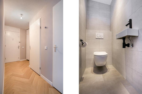 Entree en ruime hal met garderoberuimte, meterkast en toegang tot alle vertrekken. Toilet met hangend closet en fonteintje. Er is een aparte berg-/wasruimte met aansluiting voor wasmachine en droger en er is een aparte kast met opstelplaats voor zowel de cv-ketel als de mechanische ventilatie unit. De royale woonkamer is heerlijk licht en heeft uitzicht op het groen. De woonkamer is voorzien van een schuifpui naar het balkon, stucwerkwanden en pvc-vloer in visgraat motief. De open keuken is ook recent geplaatst en modern en luxe uitgevoerd. De keuken is voorzien van AEG inbouwapparatuur, zoals een inductie kookplaat, afzuigkap, combimagnetron, koel-/vriescombinatie en vaatwasser.