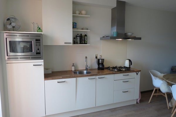 Via de woon-/eetkamer bereik je het balkon, welke gelegen is op het zuidwesten. De open keuken heeft een inbouw combi-magnetron, een 4-pits gasfornuis met afzuigkap, vaatwasser en een koelkast met vriesvak.