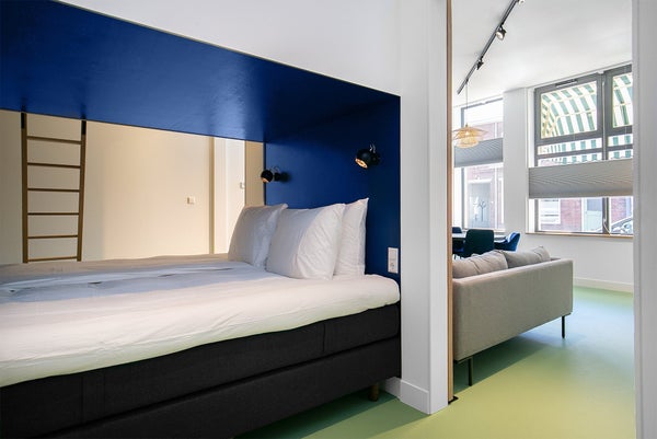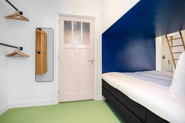Lay-out Bij binnenkomst komt u gelijk in de strak afgewerkte woon- eetkamer. De woonkamer is ingericht met 4 luxe stoelen aan een ronde tafel. nieuwe bank en grote flatscreen televisie. Keuken is voorzien van luxe apparatuur en wasmachine. Op de foto's is nog een oude situatie waarin er geen deuren tussen het slaap en leef gedeelte zitten. Deze zijn er bij oplevering wel. Het slaapgedeelte bestaat uit 2 persoons hotel bed. boven dit bed is een slaapgedeelte voor kinderen gerealiseerd. Hierdoor zijn het 2 slaapkamers in 1. De badkamer grenst hier direct aan, deze is voorzien van inloop douche, toilet, dubbele wastafel en wasmachine.