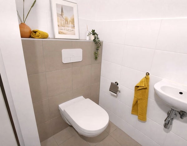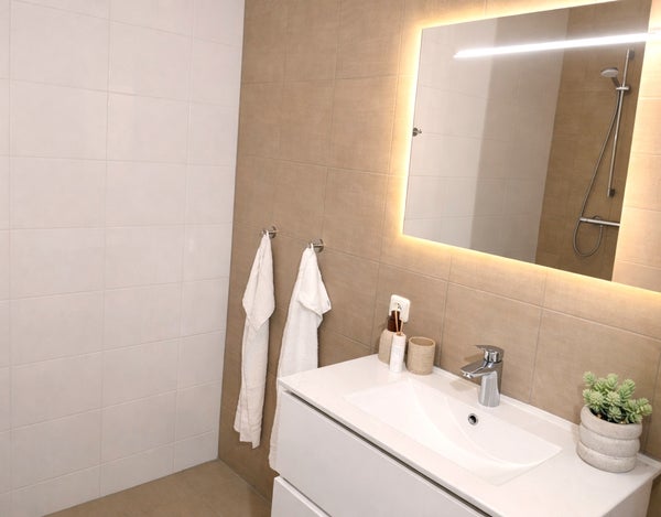 De badkamer is modern uitgevoerd met inloopdouche en wastafelmeubel. Daarnaast is er een aparte toiletruimte en een naastgelegen ruime inpandige berging/wasruimte met aansluiting voor een wasmachine en voldoende extra opbergruimte.