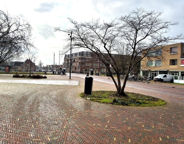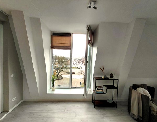De ruime en lichte woonkamer staat in directe verbinding met de open keuken. Dankzij de hoekligging en grote ramen geniet de woning van veel daglicht en een vrij uitzicht over het plein.