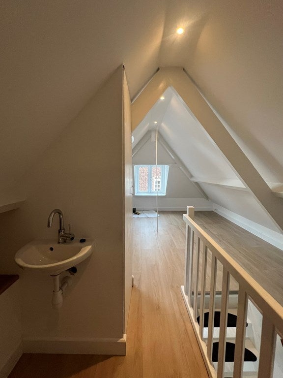 Ruime overloop met extra wastafel en wasmachine-aansluiting. Aan de achterzijde van de verdieping is de slaapkamer gelegen.