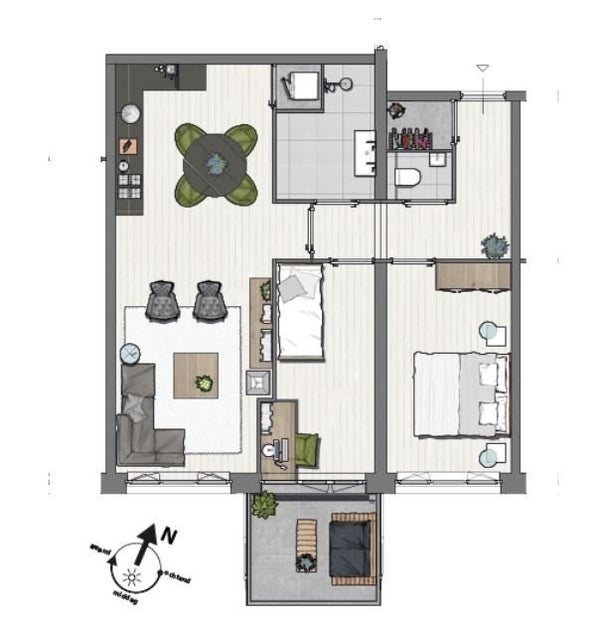 Via de entree van het appartement kom je in een ruime hal die toegang biedt tot alle vertrekken. Er is een separaat toilet met fonteintje aanwezig. De lichte en ruime woonkamer is voorzien van een moderne open keuken, uitgerust met diverse inbouwapparatuur. Dankzij de grote ramen is de ruimte heerlijk licht en heb je direct toegang tot het zonnige balkon - een fijne plek om te ontspannen met uitzicht over de omgeving. De slaapkamer is ruim opgezet en biedt eveneens toegang tot de nette badkamer, voorzien van een inloopdouche en een wastafelmeubel met spiegel.